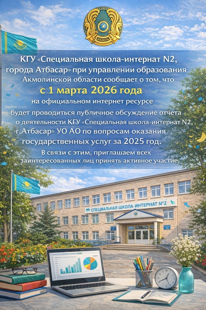 Ақмола облысы білім басқармасының жанындағы "Атбасар қаласы, N2 арнайы мектеп-интернаты" КММ 2026 жылдың 1 наурызынан бастап ресми интернет-ресурста 2025 жылға арналған мемлекеттік қызметтер көрсету мәселелері бойынша АҚ ББ "Атбасар қаласы, N2...